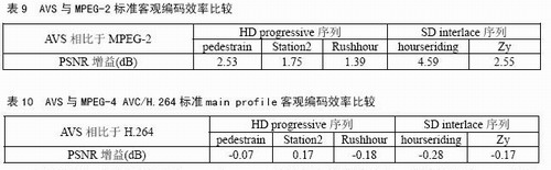 對視頻編碼標(biāo)準(zhǔn)進行客觀評價的常用方法是峰值信噪比PSNR。表9、表10分別給出了AVS與MPEG-2標(biāo)準(zhǔn)以及AVS與MPEG-4 AVC/H.264標(biāo)準(zhǔn)main