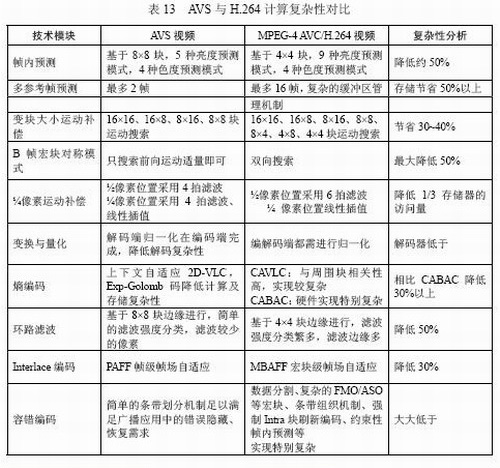表13對AVS與H.264的計算實現(xiàn)復(fù)雜性進行扼要對比,大致估算,AVS解碼復(fù)雜度相當(dāng)于H.264的30%,AVS編碼復(fù)雜度相當(dāng)于H.264的70%。