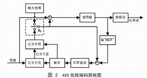 AVS視頻標(biāo)準(zhǔn)定義了I幀、P幀和B幀三種不同類型的圖像,I幀中的宏塊只進行幀內(nèi)預(yù)測,P幀和B幀的宏塊則需要進行幀內(nèi)預(yù)測或幀間預(yù)測,圖中S0是預(yù)測模式選擇開關(guān)。預(yù)測殘差進行8×8整數(shù)變換(ICT)和量化,然后對量化系數(shù)進行zig-zag掃描(隔行編碼塊使用另一種掃描方式),得到一維排列的量化系數(shù),最后對量化系數(shù)進行熵編碼。AVS視頻標(biāo)準(zhǔn)的變換和量化只需要加減法和移位操作,用16位精度即可完成。