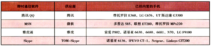 手機(jī)廠商、服務(wù)和內(nèi)容提供商都非常看好移動(dòng)即時(shí)通信市場(chǎng),已經(jīng)有大量的手機(jī)內(nèi)置了主流的即時(shí)通信軟件,例如采用Windows Mobile系列操作系統(tǒng)的智能手機(jī)都預(yù)置了MSN。雅虎、騰訊在推動(dòng)其“移動(dòng)QQ”業(yè)務(wù)時(shí),也努力說服手機(jī)廠商內(nèi)置其軟件。內(nèi)置即時(shí)通信軟件的手機(jī)型號(hào)如表l所示。