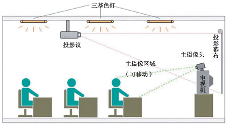 為了確保圖像的觀看效果和防止顏色對人物攝像產生的“奪目”或“反光”效應,背景墻應采取單一均勻的淺顏色(但不宜用白色),使其產生的視頻信號電平近似0.35V,而會議室其他墻壁、桌布、地毯、天花板等應與背景墻相匹配,攝像背景不宜使用畫幅。建議桌椅及墻壁采用淺駝色或淺青藍色,否則將增加攝像對象的信息量,不利于圖像質量的提高。椅子不宜采用沙發(fā)式,也不宜采用高靠背,避免擋住后面的與會者。