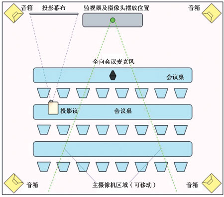 會場設計的好壞是視頻會議系統實施成敗的關鍵。視頻會議系統并不單純是將幾個視頻交換平臺和終端通過網絡連接起來就可以順利運行了,需綜合考慮會場的網絡環(huán)境、位置及大小、燈光和電源等因素,才能在會議音視頻質量、會議功能、操作簡便性及穩(wěn)定性等方面發(fā)揮最優(yōu)的功能。