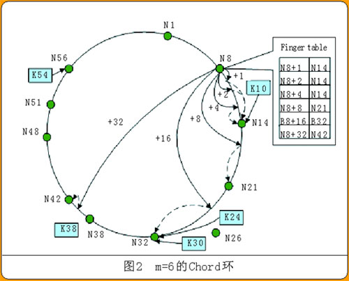 這種查詢機(jī)制只要求節(jié)點(diǎn)知道順時(shí)針?lè)较蛏献约汉竺婺莻(gè)節(jié)點(diǎn)的位置(自己的successor),查詢效率低,花費(fèi)的平均時(shí)間是函數(shù)O(N/2)的值,N是Chord環(huán)的實(shí)際節(jié)點(diǎn)數(shù)。為提高查詢效率,Chord中每個(gè)節(jié)點(diǎn)除了記錄successor和predecessor(順時(shí)針?lè)较蛏献约呵懊娴哪莻(gè)節(jié)點(diǎn))外,還要記錄m個(gè)其他節(jié)點(diǎn)。這m個(gè)節(jié)點(diǎn)由successor(n+2i-1)確定,其中n是本節(jié)點(diǎn)的哈希值,i是1到m間的整數(shù)。m個(gè)節(jié)點(diǎn)的集合就是finger表(圖2中給出N8的finger表)。這種方式下查詢資源花費(fèi)的平均時(shí)間為O(logN)。