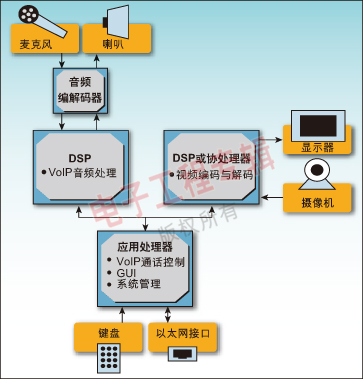 當(dāng)今應(yīng)用處理器的處理能力的增加使得我們能使用先進(jìn)的操作系統(tǒng)環(huán)境,例如嵌入式Linux來(lái)有效地將V2IP系統(tǒng)中需要的控制和媒體處理進(jìn)行劃分。這反過(guò)來(lái)又使得使用單一處理器和工具鏈的軟件開發(fā)更加簡(jiǎn)單,由于減少了一個(gè)或更多的昂貴DSP而降低了成本。