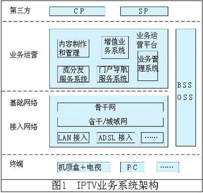 IPTV業(yè)務(wù)系統(tǒng)架構(gòu)可分為四層: 第三方業(yè)務(wù)提供者如CP和SP、業(yè)務(wù)運(yùn)營(yíng)層、網(wǎng)絡(luò)承載層和用戶(hù)終端層(如圖1)。