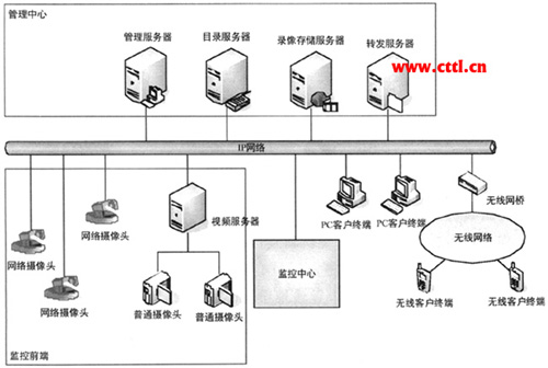 圖中管理中心和監(jiān)控前端、監(jiān)控中心是視頻監(jiān)控系統(tǒng)的組成部分,無線網(wǎng)絡(luò)部分則是視頻監(jiān)控和其他系統(tǒng)互通的一個(gè)示例。當(dāng)然視頻監(jiān)控系統(tǒng)和其他業(yè)務(wù)網(wǎng)絡(luò)共同使用時(shí),也可能會(huì)融為一體。