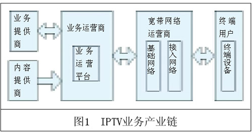 圖1所示的IPTV業(yè)務(wù)產(chǎn)業(yè)鏈中,主要角色包括內(nèi)容提供商/業(yè)務(wù)提供商(CP/SP)、業(yè)務(wù)運(yùn)營(yíng)商、網(wǎng)絡(luò)運(yùn)營(yíng)商和終端用戶。業(yè)務(wù)運(yùn)營(yíng)商具有IPTV業(yè)務(wù)運(yùn)營(yíng)資質(zhì),通過(guò)業(yè)務(wù)運(yùn)營(yíng)平臺(tái)保證業(yè)務(wù)的提供和管理運(yùn)營(yíng),起著業(yè)務(wù)主導(dǎo)的作用;內(nèi)容提供商為業(yè)務(wù)運(yùn)營(yíng)商提供內(nèi)容,業(yè)務(wù)提供商向業(yè)務(wù)運(yùn)營(yíng)商提供增值業(yè)務(wù),使得業(yè)務(wù)中的內(nèi)容和種類豐富多彩以滿足用戶的不同需求,內(nèi)容提供商和業(yè)務(wù)提供商一般能根據(jù)用戶的使用情況獲取收入分成;