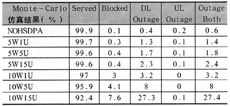 國內(nèi)某家移動運營商以國內(nèi)大城市的密集市區(qū)為范圍做了HSDPA的仿真[2],在WCDMA R99共142個站點的基礎(chǔ)上,給65個均勻分布的站點引入HSDPA。以給定HSDPA占用功率和HSDPA用戶數(shù)作為變量參數(shù),通過參數(shù)調(diào)整觀察網(wǎng)絡(luò)仿真結(jié)果的變化,再通過分析變化規(guī)律,預(yù)測引入手機電視業(yè)務(wù)可能產(chǎn)生的結(jié)果。本次仿真分為七種情況,如表2所示: