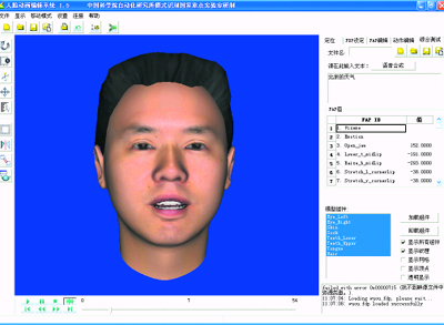 說話人頭像模塊包括語音合成、人臉動畫兩個子模塊。語音合成模塊是為了將天氣查詢獲得信息表達出來。本文中,語音合成模塊是基于中科院自動化所設計的“繪聲”語音合成系統(tǒng),該系統(tǒng)能夠將任意輸入的文本,以連續(xù)自然的聲音朗讀出來,并能夠處理中文普通話、粵語、英語等多種語言或方言。