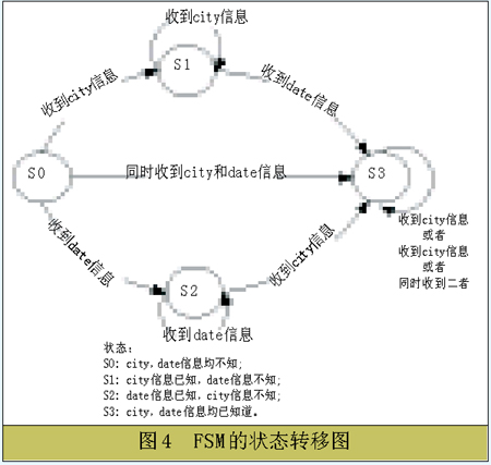 在總結了前人工作經(jīng)驗和結合本系統(tǒng)的實際問題的基礎上,我們在對話管理的具體實現(xiàn)上,將框架理論和有限狀態(tài)自動機理論相結合,完成了一個智能的對話管理模塊。我們先將對話管理限制在天氣查詢領域。在系統(tǒng)中,通過人機之間的對話和確認,系統(tǒng)需要得到要查詢的時間和地點信息之后反饋查詢結果。