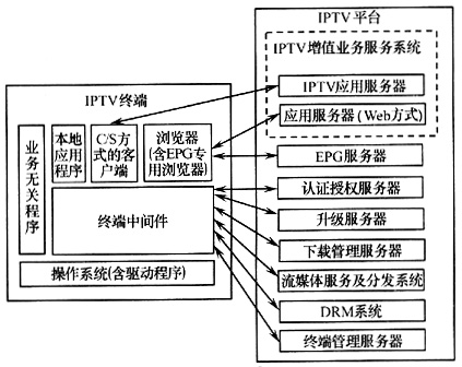 IPTV中間件是當(dāng)前IPTV業(yè)界關(guān)注的熱點(diǎn)之一。業(yè)界對(duì)于中間件沒(méi)有確切的定義,一般認(rèn)為:中間件是實(shí)現(xiàn)異構(gòu)軟件實(shí)體間互連互通的一類(lèi)軟件,則IPTV中間件就是實(shí)現(xiàn)IPTV系統(tǒng)中各個(gè)節(jié)點(diǎn)之間互連互通的一類(lèi)軟件。IPTV系統(tǒng)中的節(jié)點(diǎn)類(lèi)型眾多,包括終端、EPG(電子節(jié)目指南)服務(wù)器、內(nèi)容分發(fā)系統(tǒng)、業(yè)務(wù)管理系統(tǒng)、網(wǎng)管監(jiān)控系統(tǒng)、DRM(數(shù)字版權(quán)管理)、內(nèi)容管理系統(tǒng)、頭端系統(tǒng)等,除終端外,其他節(jié)點(diǎn)都可以統(tǒng)稱(chēng)為平臺(tái)側(cè),因此IPTV中間件也可以分為平臺(tái)中間件和終端中間件兩類(lèi)。平臺(tái)中間件實(shí)現(xiàn)系統(tǒng)平臺(tái)中各個(gè)應(yīng)用服務(wù)器之間的互連互通,終端中間件實(shí)現(xiàn)IPTV終端和系統(tǒng)平臺(tái)之間的互連互通。