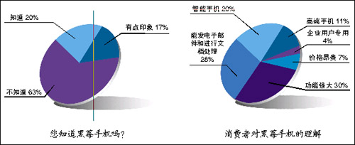 根據(jù)調(diào)查結(jié)果,目前國內(nèi)知道黑莓手機(jī)的消費(fèi)者僅占20%,有63%的消費(fèi)者從沒有聽說過“黑莓”這個(gè)名字,還有17%的消費(fèi)者只是有點(diǎn)印象。