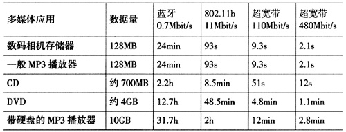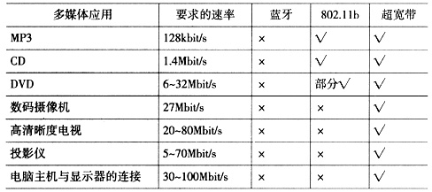 2.0接口相當,遠遠高于無線局域網(wǎng)802.11b的11 Mbit/s,也比下一代無線局域網(wǎng)802.11a/g的54 Mbit/s高出近一個數(shù)量級。UWB通信的功耗較低,能更好地滿足使用電池的移動設(shè)備的要求。另外,UWB信號的功率譜密度非常低,信號難以被檢測到,再加上采用的跳頻、直接序列擴頻等擴頻多址技術(shù),使非授權(quán)者很難截獲傳輸?shù)男畔ⅲ蚨踩苑浅:。?是一些典型的實時多媒體應(yīng)用對不同無線傳輸技術(shù)的數(shù)據(jù)傳輸速率的要求。從表中可以看出,如果采用無線的方式來進行傳輸,只有UWB技術(shù)可以滿足各種應(yīng)用的要求。