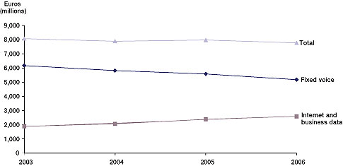 但問(wèn)題是,在發(fā)達(dá)國(guó)家,用戶寬帶接入市場(chǎng)已經(jīng)接近飽和。正因?yàn)槭沁@樣一種情況,所以用戶數(shù)量也就很難再有增加。ARPU值在極大的競(jìng)爭(zhēng)壓力下也很難有很大的突破。一切都靜止不動(dòng),固話收入持續(xù)下降,所以圖中的“'Internet