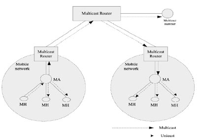 IETF的移動(dòng)IP協(xié)議定義了家鄉(xiāng)代理(home Agent,簡(jiǎn)稱(chēng)HA)、外地鏈路、外地代理(foreign Agent,簡(jiǎn)稱(chēng)FA)、通信對(duì)端等概念,一個(gè)移動(dòng)節(jié)點(diǎn)擁有兩個(gè)IP地址:家鄉(xiāng)地址和轉(zhuǎn)交地址。節(jié)點(diǎn)在移動(dòng)過(guò)程中,家鄉(xiāng)地址不改變,發(fā)送到該節(jié)點(diǎn)的數(shù)據(jù)都通過(guò)家鄉(xiāng)地址與轉(zhuǎn)交地址之間的隧道轉(zhuǎn)發(fā)給移動(dòng)節(jié)點(diǎn)。當(dāng)組成員切換時(shí),包括網(wǎng)絡(luò)鏈路間切換的固有時(shí)延,以及重新加入組播組以及建立組播轉(zhuǎn)發(fā)樹(shù)的時(shí)延,都將導(dǎo)致組播成員丟包。