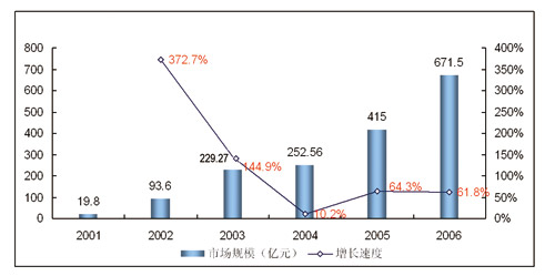圖 2001-2006年中國移動用戶增值業(yè)務(wù)市場規(guī)模