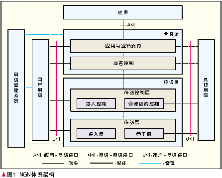 NGN基于IP技術,采用業(yè)務層和傳送層相互分離、應用與業(yè)務控制相互分離、傳送控制與傳送相互分離的思想,能夠支持現(xiàn)有的各種接入技術,提供話音、數(shù)據(jù)、視頻、流媒體等業(yè)務,并且支持現(xiàn)有移動網(wǎng)絡上的各種業(yè)務,實現(xiàn)固定網(wǎng)絡和移動網(wǎng)絡的融合,此外還能夠根據(jù)用戶的需要,保證用戶業(yè)務的服務質(zhì)量。NGN的網(wǎng)絡體系架構如圖1所示,