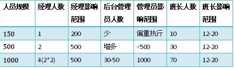 當(dāng)員工人數(shù)到達(dá)500人的時(shí)候,班長(zhǎng)往往有30位左右。很多經(jīng)理已經(jīng)不能夠?qū)γ课话嚅L(zhǎng)有足夠的了解,更不要說(shuō)去認(rèn)識(shí)大部分員工。這個(gè)時(shí)候,經(jīng)理對(duì)班長(zhǎng)的比例過(guò)寬,需要強(qiáng)化后臺(tái)管理員的角色。比如排班、績(jī)效、質(zhì)量管理(而不僅是評(píng)估)、信息分析(數(shù)據(jù)和報(bào)告)、行政、培訓(xùn)等工作中,這些管理輔助角色都在逐漸強(qiáng)化。而每一個(gè)后臺(tái)管理者可能成了經(jīng)理的直接下屬,他們起草的流程和制度,來(lái)由經(jīng)理決策。某種程度上說(shuō),他們比班長(zhǎng)的影響力更大,因?yàn)榘嚅L(zhǎng)還是影響著12-20人。有時(shí)候后臺(tái)管理員也決定了班長(zhǎng)的時(shí)間精力分配,那是班長(zhǎng)最寶貴的資源。那么誰(shuí)是管理者呢?首先是經(jīng)理,其次是后臺(tái)管理員,最后才是班長(zhǎng)。