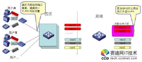 考慮到業(yè)務(wù)特性,上網(wǎng)業(yè)務(wù)通常需要對(duì)用戶進(jìn)行精細(xì)化管理,而對(duì)IPTV業(yè)務(wù)通常采用較粗獷的管理模式,因此我們建議通過(guò)如下方式來(lái)做VLAN規(guī)劃:對(duì)上網(wǎng)業(yè)務(wù),采用PUPV(每用戶一VLAN),對(duì)于IPTV/VOIP業(yè)務(wù),采用PSPV(每業(yè)務(wù)一VLAN),即同一園區(qū)內(nèi)的IPTV用戶采用同一VLAN,不同園區(qū)的IPTV/VOIP用戶采用不同的業(yè)務(wù)VLAN,在局端,通過(guò)靈活QINQ對(duì)上網(wǎng)業(yè)務(wù)的VLAN打外層標(biāo)簽,對(duì)于IPTV業(yè)務(wù)的VLAN不打外層標(biāo)簽。