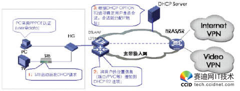 當(dāng)網(wǎng)絡(luò)設(shè)備收到STB的DHCP請(qǐng)求報(bào)文時(shí),需要在報(bào)文后添加OPTION82字段,此時(shí)有兩種模式進(jìn)行DHCP+認(rèn)證,一種是直接把DHCP報(bào)文送給DHCP服務(wù)器,由DHCP服務(wù)器根據(jù)OPT82字段來(lái)判斷該用戶是否為合法用戶,從而決定是否為其分配IP地址。另一種是DHCP報(bào)文先送到BRAS,由BRAS將OPT82字段放到RADIUS的一個(gè)子域里,通過(guò)RADIUS服務(wù)器來(lái)進(jìn)行用戶合法性認(rèn)證,若用戶合法,再由DHCP服務(wù)器分配IP地址。