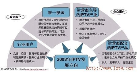2008年,IPTV市場,因為發(fā)展速度明顯慢于了市場進度和技術演進。因此在原有的運營商產(chǎn)業(yè)化推動形勢下,終端廠家推動下的產(chǎn)品化發(fā)展模式也會得到更大的發(fā)展空間,而這在一定程度上雖會推動用戶對IPTV的認知度,同時也會分化一部分IPTV產(chǎn)業(yè)化的動力。