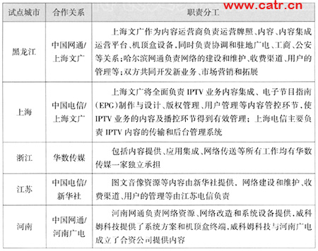 從業(yè)務參與角度來看,電信行業(yè)方面所開展的業(yè)務一般都是與其它行業(yè)合作的。表1是典型IPTV試點城市合作方與職責分工情況。