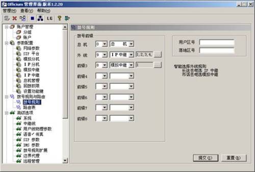 IP PBX 進(jìn)行配置(如圖)。人機(jī)界面簡潔易懂,即便是不懂通訊的外行人,在看過說明書后也能輕松自如地使用。配置起來簡單,例如選擇外線撥號前綴號、做呼叫中心時的ACD輪循分機(jī)線路輪循、回?fù)艿龋瑑H僅選下數(shù)字點下提交,幾秒內(nèi)就可配置結(jié)束。