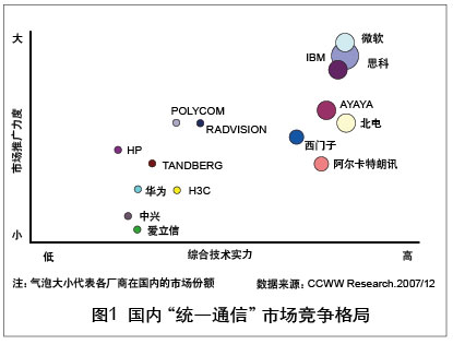 “統(tǒng)一通信”與傳統(tǒng)通信的根本區(qū)別在于不僅僅是網(wǎng)絡(luò)的融合,也是應(yīng)用的融合。從這個(gè)層面來(lái)看,“統(tǒng)一通信”真正帶給用戶的是成本的降低、工作效率的提升以及整個(gè)運(yùn)行機(jī)制的改變。“統(tǒng)一通信”是以人性化為特征應(yīng)用層面的融合,這種融合囊括了更多的內(nèi)容、覆蓋更廣闊的領(lǐng)域、具有更大的力量,它使得通信產(chǎn)業(yè)與IT產(chǎn)業(yè),通信設(shè)備商、軟件廠商與電信運(yùn)營(yíng)商之間的邊界越來(lái)越模糊,跨行業(yè)、跨領(lǐng)域的聯(lián)盟與合作成為開(kāi)拓市場(chǎng)的必需。但隨著眾廠商的紛紛加入,多款“統(tǒng)一通信”產(chǎn)品及解決方案的推出,“統(tǒng)一通信”市場(chǎng)展現(xiàn)出了勃勃生機(jī)和巨大的成長(zhǎng)潛力。在這些廠商中,有市場(chǎng)調(diào)研數(shù)據(jù)顯示思科市場(chǎng)份額領(lǐng)先,市場(chǎng)占有率高達(dá)35%。各類廠商之間既有競(jìng)爭(zhēng)又有合作,但還沒(méi)有一個(gè)廠商占絕對(duì)優(yōu)勢(shì)。實(shí)際上,“統(tǒng)一通信”市場(chǎng)上的競(jìng)爭(zhēng)者并不僅僅是這幾家巨頭,眾多網(wǎng)絡(luò)工具廠商、商用電話廠商也參與了這一競(jìng)爭(zhēng)平臺(tái)。幾乎所有和ICT有關(guān)的巨頭廠商都集中在了這個(gè)領(lǐng)域,“統(tǒng)一通信”正進(jìn)入群雄爭(zhēng)霸的時(shí)代。國(guó)內(nèi)“統(tǒng)一通信”市場(chǎng)競(jìng)爭(zhēng)格局如圖1所示。