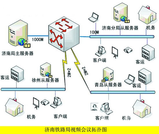 根據(jù)濟南鐵路局的視頻會議規(guī)劃和網(wǎng)絡現(xiàn)狀,視維(即山大聯(lián)潤信息科技有限公司)與路局共同設計了會議系統(tǒng)解決方案,在濟南、青島、徐州部署4臺高性能視頻服務器系統(tǒng),利用路局內網(wǎng)和公網(wǎng)搭建了覆蓋全路的視頻會議服務平臺。路局的兩臺服務器可以互備,提供了服務器系統(tǒng)和網(wǎng)絡系統(tǒng)的雙備份,大大提高了系統(tǒng)的可靠性。