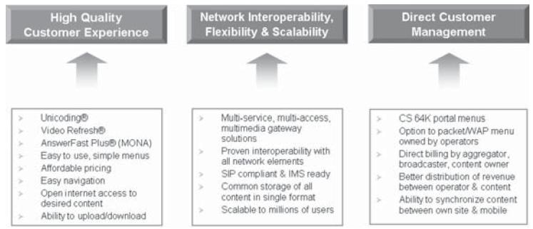 雖然視頻和多媒體服務(wù)的突然火熱對消費(fèi)者、企業(yè)和業(yè)界來說都是件好事,但存在的挑戰(zhàn)還是很多,如怎樣提供高質(zhì)量的用戶體驗(yàn)、解決手機(jī)和網(wǎng)絡(luò)可互操作性問題,以及集成商、廣播媒體和內(nèi)容提供商的直接用戶接觸與管理問題。這些問題的主要技術(shù)解決方案提供者有Unicoding、Video Refresh和AnswerFast Plus (MONA的一部分),同時(shí)多媒體網(wǎng)關(guān)解決方案也包括在內(nèi)。其它方面的可互操作性和用戶體驗(yàn)改善問題很容易能解決,對今天現(xiàn)有的WAP服務(wù)是一種補(bǔ)充。