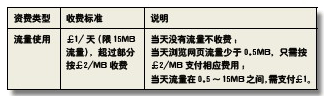 注:(1)用戶可以免費瀏覽Vodafone Live!和My Account,£1/天的數(shù)據(jù)業(yè)務(wù)資費不包括VoIP、Peer-to-Peer等業(yè)務(wù)所發(fā)生的費用,這些業(yè)務(wù)按£2/MB收費,每單位流量(KB)最少資費為5p;(2)£1費用大約可以瀏覽600個網(wǎng)頁或下載15分鐘的視頻。