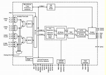 圖2所示為視頻解碼器的數(shù)據(jù)流路徑,它負(fù)責(zé)處理NTSC、PAL、SECAM、S-Video、SCART、YPbPr、RGB、480p和其它輸入格式。在數(shù)字電視中,對(duì)這種級(jí)別的靈活性的支持是必需的,完全是為了讓一個(gè)機(jī)型經(jīng)過實(shí)際設(shè)置可以工作于任何格式。數(shù)字電視解碼器的典型性能特征包括:同步、消隱、場(chǎng)、有源視頻窗口、水平和垂直同步、時(shí)鐘、同步鎖相(用于下行視頻編碼同步)、主CPU中斷和可編程邏輯I/O信號(hào)。這是對(duì)數(shù)字視頻輸出以及用于先進(jìn)的垂直消隱期(VBI)數(shù)據(jù)恢復(fù)的補(bǔ)充。作為一種附加功能,一些視頻解碼器支持VBI數(shù)據(jù)處理器(VDP)在文字電視廣播、傳送字幕(CC)和其它VBI數(shù)據(jù)上進(jìn)行數(shù)據(jù)分片、解析和執(zhí)行誤碼校驗(yàn)。內(nèi)置的FIFO存儲(chǔ)多達(dá)11行文字電視廣播數(shù)據(jù),而適當(dāng)?shù)闹鹘涌谕郊叭聊晃淖蛛娨晱V播恢復(fù)是當(dāng)今系統(tǒng)中的幾個(gè)常見要求。然而,一些實(shí)現(xiàn)方案需要一種解碼器,它能夠?yàn)榛谥鰿PU的VBI處理提供速度為已采樣原始亮度數(shù)據(jù)兩倍的輸出格式化數(shù)據(jù)。