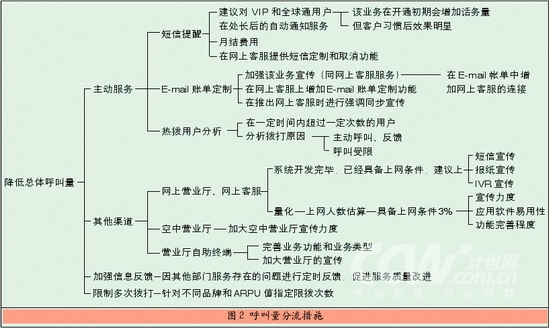 在給某移動運(yùn)營商進(jìn)行的接通率優(yōu)化咨詢項(xiàng)目中,利用呼叫中心接通率優(yōu)化模型進(jìn)行了分析,圖2是針對分流呼叫中心總體呼叫量所提出的建議措施。