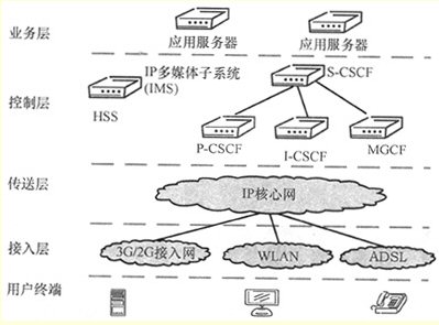 IMS使用會(huì)話發(fā)起協(xié)議(SIP)作為建立、控制、修改和終止兩個(gè)或者更多個(gè)參與者之間的語(yǔ)音、視頻和消息等會(huì)話的信令協(xié)議。在IMS中,與SIP相關(guān)的信令點(diǎn)稱為呼叫狀態(tài)控制功能信令點(diǎn),并且根據(jù)它們功能的不同而有所區(qū)分。IMS中與鑒權(quán)、授權(quán)、計(jì)費(fèi)相關(guān)的功能基于IETF、Diameter協(xié)議,是在HSS、CSCF等IMS組件上實(shí)現(xiàn)的,提供業(yè)務(wù)收費(fèi)功能。HSS是與用戶和服務(wù)相關(guān)的數(shù)據(jù)的主要存儲(chǔ)器,由2G移動(dòng)通信網(wǎng)的HLR演進(jìn)而來(lái)。業(yè)務(wù)層上的應(yīng)用服務(wù)器提供各種業(yè)務(wù)邏輯,實(shí)現(xiàn)多種電信增值業(yè)務(wù)。傳送層的IP核心網(wǎng)是IMS業(yè)務(wù)的統(tǒng)一承載網(wǎng)絡(luò)。接入層提供包括2G、3G(UMTS、cdma2000)、WLAN、ADSL等在內(nèi)的多種接入方式。