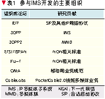3GPP采用和其他標(biāo)準化組織密切合作的方式制訂IMS技術(shù)標(biāo)準,并依靠各國通信界的協(xié)同不斷發(fā)展和完善(如表1所示)。其中,最重要的合作就是和IETF聯(lián)合開發(fā)了IMS網(wǎng)絡(luò)的核心控制協(xié)議SIP[1],共同研究SIP的擴展和應(yīng)用。另一個重要的合作是和Parlay組織聯(lián)合開發(fā)了支持開放式業(yè)務(wù)提供的Parlay/開放業(yè)務(wù)接入(OSA)應(yīng)用程序接口(API),將源于固定智能網(wǎng)結(jié)構(gòu)開放的Parlay技術(shù)引入IMS網(wǎng)絡(luò)的OSA結(jié)構(gòu)[2]。最重要的協(xié)同就是ETSI的TISPAN研究組和ITU-T提出了IMS中融入固定接入的技術(shù)[3],另一個重要的協(xié)同是OMA組織提出了許多基于IMS實現(xiàn)的業(yè)務(wù)規(guī)范和技術(shù)[4]。