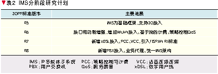 3GPP依照UMTS 3G移動通信系統(tǒng)的系列標(biāo)準版本定義了IMS的分階段演進計劃[5],如表2所示。其中,2002年完成的R5是第一個全IP移動網(wǎng)絡(luò)標(biāo)準,它將核心網(wǎng)歸為一個統(tǒng)一的基于IP的分組(PS)域,具有服務(wù)質(zhì)量(QoS)保證,能夠提供各種類型的多媒體增值業(yè)務(wù),其核心技術(shù)標(biāo)準就是IMS。R6進一步完善IMS接口和功能,增加對于WLAN的接入支持,并研究IMS域的計費和QoS控制技術(shù)。R7融合TISPAN關(guān)于NGN的研究標(biāo)準,增加對于xDSL接入技術(shù)的支持,提出策略控制與計費(PCC)技術(shù)以及WLAN/3G語音連續(xù)通信的話音連接連續(xù)(VCC)技術(shù)。正在研究中的R8將協(xié)同各個標(biāo)準化組織的工作,研究支持組合業(yè)務(wù)的業(yè)務(wù)代理技術(shù)以及下一步的統(tǒng)一IMS架構(gòu)。