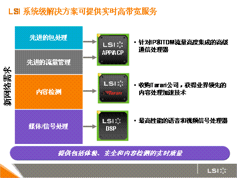 目前,只有很少的技術(shù)專家能夠向移動運(yùn)營商提供推出這些新服務(wù)所需要的世界級解決方案。因為這需要技術(shù)提供者在通信網(wǎng)絡(luò)領(lǐng)域有著深厚的專業(yè)精深技能和高度的系統(tǒng)級解決方案能力。在通信帶寬和實時業(yè)務(wù)提供及系統(tǒng)靈活性存在矛盾時,系統(tǒng)設(shè)計的挑戰(zhàn)變得至關(guān)緊要。 在其他廠商為解決其中任何之一的技術(shù)問題而忙碌的時候,世界上有哪個公司可以利用系統(tǒng)的通信處理器綜合設(shè)計(包括通信1-7層)將帶寬,實時和靈活性三者完美結(jié)合,他便是最終的贏家。LSI就是這些少數(shù)技術(shù)專家之一。它能提供一整套解決方案來提供實時高帶寬服務(wù),包括高級網(wǎng)絡(luò)通信處理器、內(nèi)容檢測技術(shù)和DSP技術(shù)。