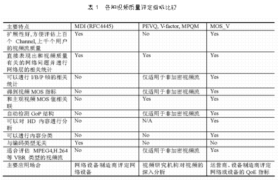MOS_V,另一種是視頻的全參考(Full Reference)質(zhì)量評定。幾種評定方面的簡單比較如表1所示,相應指標的介紹可以參考《電信網(wǎng)技術(shù)》2007年第12期的《IPTV QoE測試指標概述》。