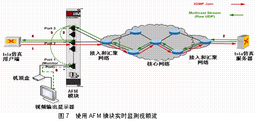 另外一種常見的應用場景是對網(wǎng)絡中存在的IPTV組播流和單播流能夠進行被動實時監(jiān)測并能夠評估相應視頻流的視頻質(zhì)量。IXIA獨特的視頻流提取模塊AFM支持該特性的測試(見圖6)。