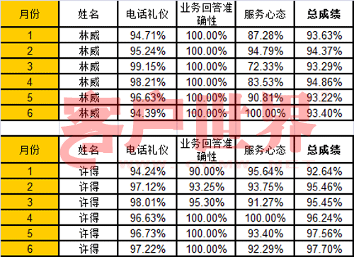 上面這兩張表格,是兩位員工的質(zhì)檢分數(shù),從今年一月份開始,一月到六月每個月的質(zhì)檢分數(shù),你看到有總分,還有三個分項的成績。請問,林威是新員工,還是許得是新員工?我們下一期公布答案。