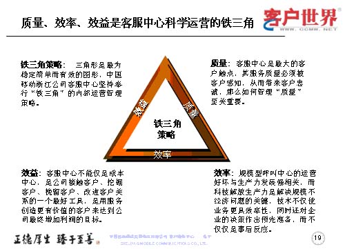 應(yīng)該說這三個方面是科學(xué)運營的一個鐵三角,這是我們的理解,因為三角形,始終認(rèn)為是最穩(wěn)定、簡單、有效的圖形,也是我們在進(jìn)行內(nèi)部運營的管理鐵架。質(zhì)量是客服中心最大的觸點當(dāng)中被客戶感知,從而帶來客戶忠誠的,如何管理質(zhì)量,那就至關(guān)重要。效率尤其是規(guī)模型的呼叫中心的運營好壞,是與生產(chǎn)力的發(fā)展強(qiáng)相關(guān),而科技解放生產(chǎn)力是解決規(guī)模問題的關(guān)鍵。技術(shù)不僅是運行更具效益率,同時還對企業(yè)的決策作出預(yù)先準(zhǔn)備,而不僅僅是事后反應(yīng)。很多年來,更多的企業(yè)是把客服中心視為成本中心,而事實上,效益的顯現(xiàn)讓我們陸續(xù)地走出了成本中心,它應(yīng)該是公司接觸客戶、挖掘客戶、挽留客戶、改進(jìn)客戶關(guān)系的一個最好工具,是用服務(wù)創(chuàng)造更有價值的客戶,來達(dá)到公司最終增加利潤的目標(biāo)。