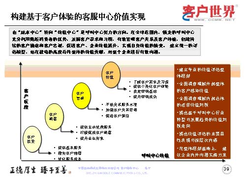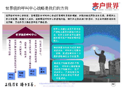 最后我想世界級的呼叫中心戰(zhàn)略是我們從事客戶服務(wù)行業(yè),從事呼叫中心人的方向,從我們理解的世界級呼叫中心特征來講,管理團(tuán)隊?wèi)?yīng)對呼叫中心的運營原理有系統(tǒng)的理解,并貼切地應(yīng)用到業(yè)務(wù)實踐,創(chuàng)造積極向上的工作氛圍,鼓勵員工成長,能夠闡述呼叫中心的戰(zhàn)略價值,制訂并達(dá)到本部門的目標(biāo),為企業(yè)利潤的增長作出杰出的貢獻(xiàn),杰出的員工滿意度和客戶滿意度。所以世界級呼叫中心我們理解是從七個方面來衡量,以“客戶為中心”,多種客戶溝通的聯(lián)絡(luò)渠道,低員工流失率和高客戶滿意度,高效率、低成本,高“一次性解決率”,對客戶服務(wù)請求的快速反應(yīng)與處理,技術(shù)驅(qū)動與創(chuàng)新。