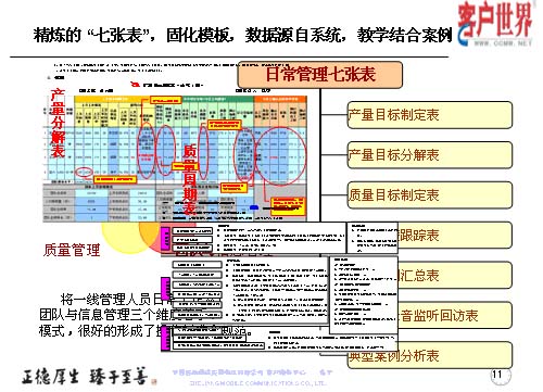 我們精煉了這么七張表的方式,運用三個維度:產(chǎn)量管理、質(zhì)量管理和團(tuán)隊與信息管理,而這些基礎(chǔ)數(shù)據(jù)都來自于系統(tǒng),教學(xué)和案例。而七張表是從產(chǎn)量、質(zhì)量和團(tuán)隊信息來展現(xiàn)出具體的一些應(yīng)用,將一線管理人員從日常工作的三個維度入手,形成七張表管理模式,很好地具備了操作標(biāo)準(zhǔn)和規(guī)范。這模板表除了系統(tǒng)出來的一些數(shù)據(jù)以外,通過我們基層管理人員的項目執(zhí)行和跟蹤檢查,形成一些案例,改進(jìn)計劃和改進(jìn)意見。這幾張表多為系統(tǒng)自身所產(chǎn)生一些具體的數(shù)據(jù),比如說上個月的指標(biāo)值如何設(shè)定,實際達(dá)成的產(chǎn)量怎樣,回訪滿意率具體有哪些數(shù)據(jù),都在客服系統(tǒng)的報表中提煉出來的相關(guān)數(shù)據(jù)。