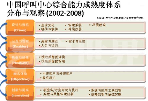 在過去幾年我們也做了很多研究,一個(gè)呼叫中心整合持續(xù)建設(shè)在哪些方面應(yīng)該做定義。基本上我們是分為五個(gè)方面,在每一級的成熟度方面,我們的呼叫中心都關(guān)注自己的成熟度。1、設(shè)計(jì)與規(guī)范;2、運(yùn)營管理;3、數(shù)據(jù)與績效;4、顧客體驗(yàn);5、創(chuàng)新與提高。第五方面創(chuàng)新與提高在CMM模型中是特有的,它在整個(gè)產(chǎn)業(yè)的發(fā)展過程中,提供戰(zhàn)略革新和戰(zhàn)略工具一體化使用的指導(dǎo)框架和最佳實(shí)踐。