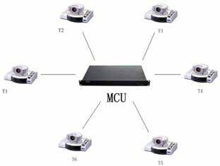 在會議場點(diǎn)數(shù)目不多且地域分布比較集中時,可采用單MCU方式,其組網(wǎng)結(jié)構(gòu)見圖所示。圖中T1-T6均為視頻會議終端系統(tǒng)設(shè)備。