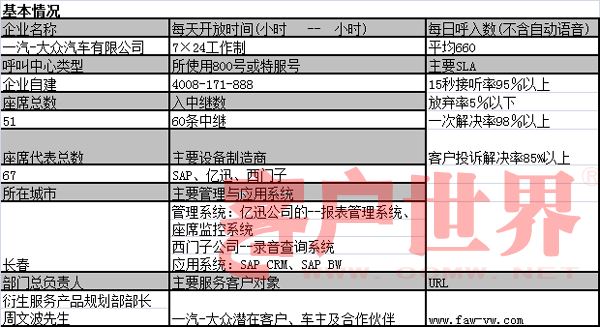 目前一汽-大眾旗下有奧迪、大眾兩個(gè)品牌,涉及十幾種汽車(chē)產(chǎn)品,全部由呼叫中心通過(guò)4008 171 888和0431-85990888兩個(gè)號(hào)碼來(lái)統(tǒng)一服務(wù)。一汽-大眾呼叫中心為了提高客戶滿意度,把座席分成奧迪、大眾兩個(gè)品牌獨(dú)立服務(wù);熱線電話的IVR設(shè)置分為一層,奧迪請(qǐng)按“1”,大眾請(qǐng)按“2”,提供清晰便捷的服務(wù),為客戶提供售前咨詢(xún)、售后咨詢(xún)、售前投訴、售后投訴服務(wù);結(jié)構(gòu)清晰而且采用主動(dòng)服務(wù)和客戶關(guān)愛(ài)的服務(wù)理念。為了最大限度接通每一通電話,將呼損率作為部門(mén)的KPI績(jī)效指標(biāo)。并不斷的提升整體服務(wù)水平。