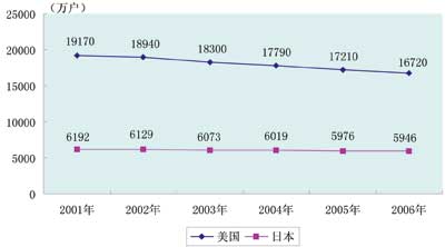 關(guān)于固定電話受沖擊的現(xiàn)象,美國比日本更加突出,這是因?yàn)槊绹蟮耐ㄐ殴境颂峁╇娫、電視和高速上網(wǎng)捆綁服務(wù)外,基本上不提供IP電話(普通電話機(jī)經(jīng)本地市話交換機(jī)以及網(wǎng)關(guān)進(jìn)入因特網(wǎng))和VoIP電話(普通電話機(jī)經(jīng)電話連接器進(jìn)入因特網(wǎng))。美國衛(wèi)生統(tǒng)計(jì)中心公布的數(shù)據(jù)顯示,2007年下半年,美國只有移動(dòng)電話而沒有固定電話的家庭比例達(dá)到15.8%,這一比例在2004年同期只有6.1%,大約2%的美國家庭沒有電話。