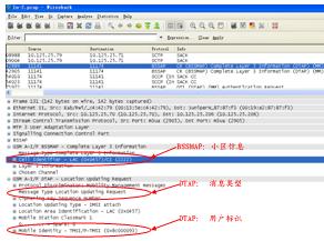 以上是一個(gè)用戶開(kāi)機(jī)的信令過(guò)程,在BSSMAP消息層中,可以獲取CGI=0X0457-2222;在DTAP消息層中,可以獲得獲得本次消息類型為L(zhǎng)ocationUpdatingREQ,同時(shí)用戶標(biāo)識(shí)為T(mén)MSI=0X8c000093,通過(guò)對(duì)對(duì)之前或之后(簽權(quán)、IDREQ/RSP)等信令的關(guān)聯(lián),可以獲得用戶IMSI、MSISDN和CGI的對(duì)應(yīng)關(guān)系。其它信令過(guò)程,如周期性位置更新、短信收發(fā)、主被叫等,和以上分析過(guò)程類似。