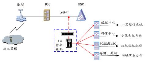 A口信令檢測(cè)的應(yīng)用非常廣泛,如網(wǎng)絡(luò)質(zhì)量分析系統(tǒng)、小區(qū)短信、小區(qū)彩信、垃圾短信攔截等。這些正成為通信運(yùn)營(yíng)商的業(yè)務(wù)增長(zhǎng)點(diǎn)。其業(yè)務(wù)應(yīng)用組網(wǎng)圖如下: