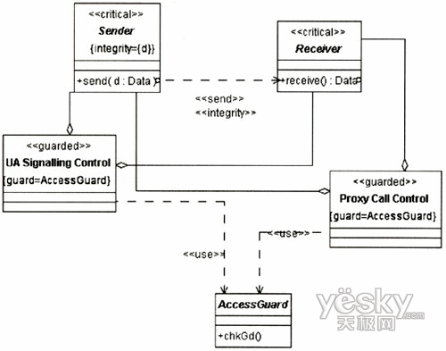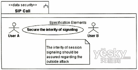 圖3中的UA代表UserA或UserB的UA,因為兩個UA的信令交互需要通過Proxy,且其安全需求是一致的,故在圖中只表現(xiàn)出一方。UA和Proxy均是基于通用計算平臺的節(jié)點,其訪問控制需要受到保護(hù),故對其標(biāo)記上定型《guardedaccess》。UA中除處理信令外,還需處理媒體流的編解碼與控制,這個用例中只涉及信令的安全性,故在UA中只關(guān)注進(jìn)行信令控制的組件。UA與Proxy之間的通信基于IP承載,根據(jù)表1定義的威脅函數(shù):ThreatA(IP